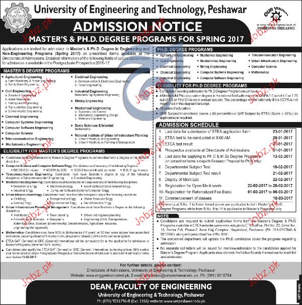 University of Engineering and Technology Admission in Master and Phd Programs in Peshawar. Read newspaper ad for exact details.
