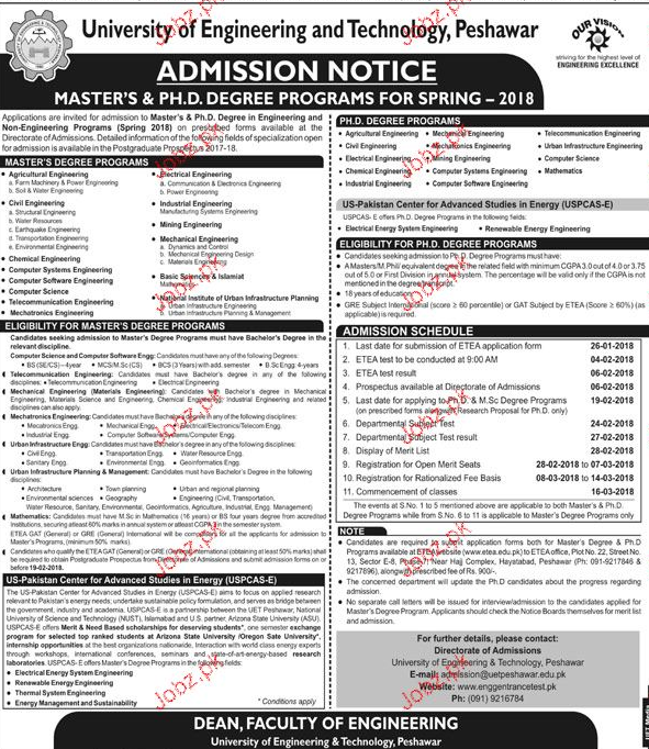 University of Engineering and Technology Admission MA / MSc in Structural Engineering, Eelctrical Engineering, Industrial Engineering and PHD in Peshawar. Read newspaper ad for exact details.