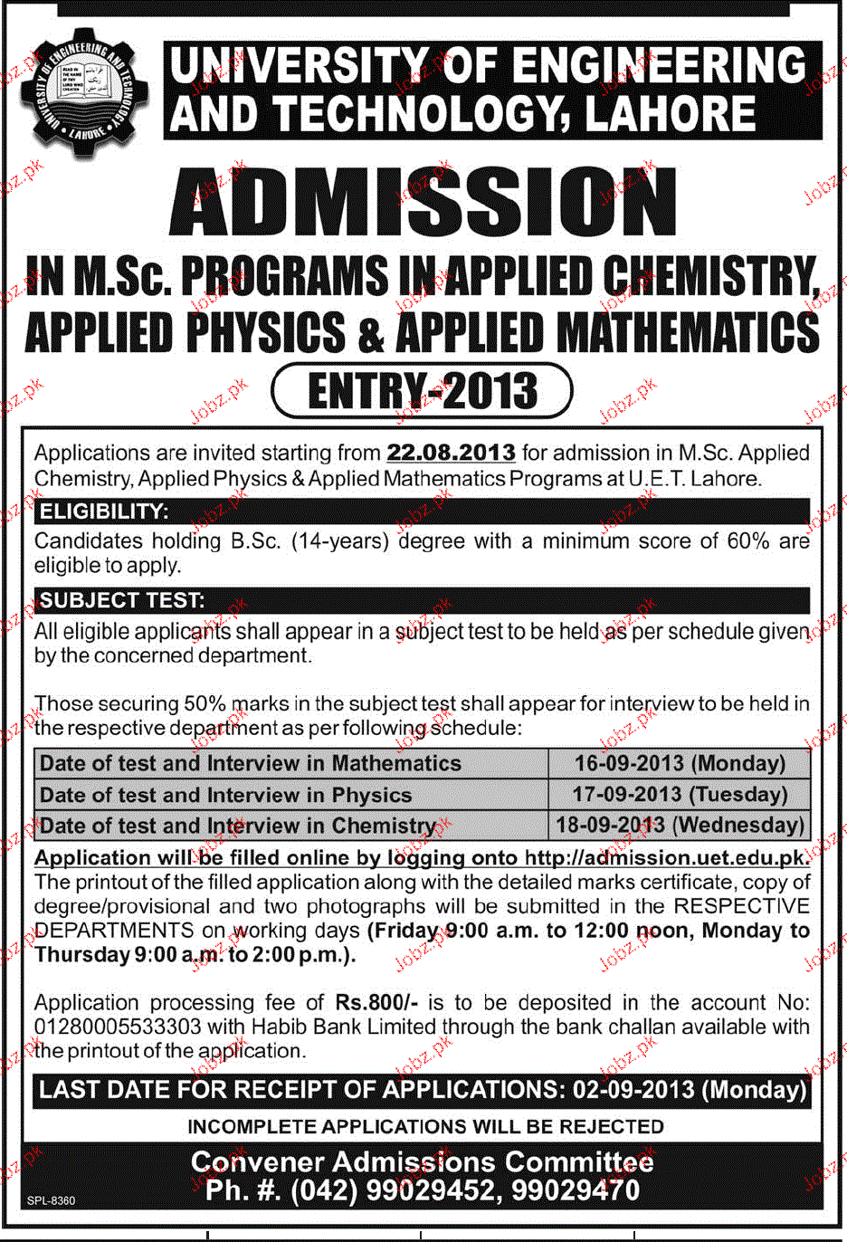 University of Engineering and Technology Admission in MSc in Lahore Read newspaper ad for exact details.