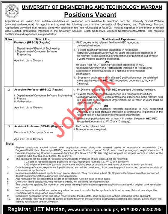 University of Engineering and Technology UET is inviting hardworking, qualified and energetic candidates for the posts of Professor Electrical Engineering, Professor Computer Software Engineering, Associate Professor Computer Software Engineering, Associate Professor Physics, Associate Professor Mathematics, Assistant Professor Computer Sciences in Mardan.