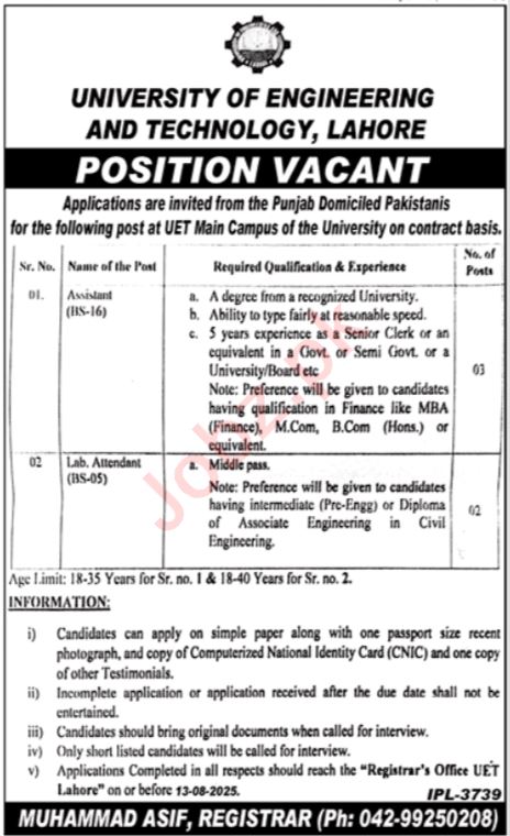 University of Engineering and Technology UET invites applications for job positions advertised in daily Jang dated 27 July 2025 for following vacancies in Lahore, lahore Punjab Pakistan.