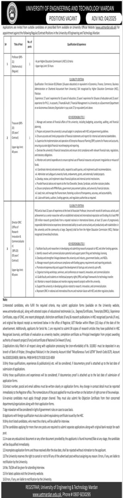 University of Engineering and Technology UET Mardan, mardan Khyber Pakhtunkhwa KPK Pakistan invites applications from eligible candidates for the post of director oric, professor and treasurer as per advertisement of June 19, 2025 published in daily The News Newspaper. Persons with Bachelor, Master, Mphil and Phd etc. education can apply.