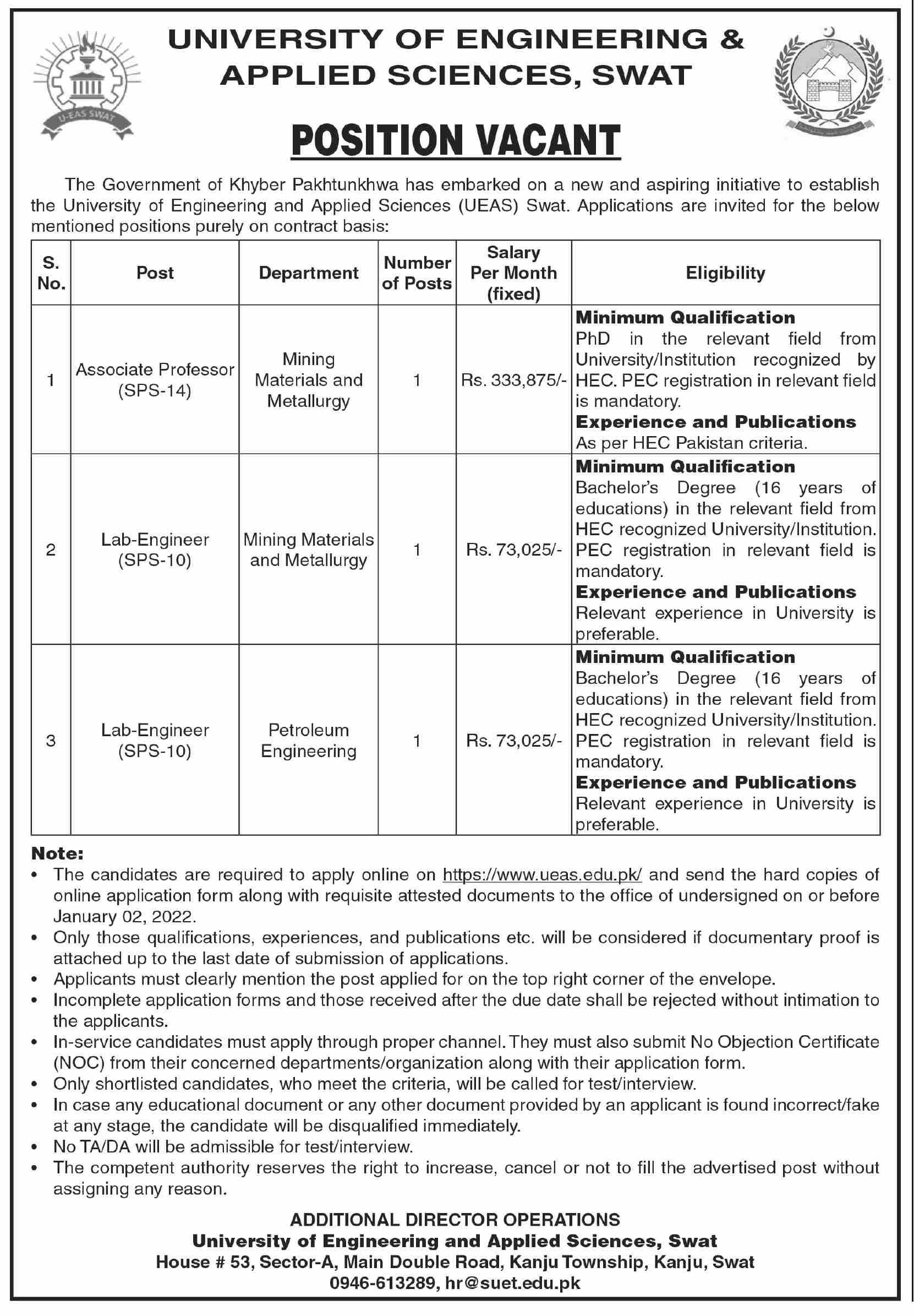 University of Engineering & Applied Sciences Swat invites applications from highly educated expert and experienced professionals for the post of Associate Professor, Associate Professor Mining Materials and Metallurgy, Lab Engineer Mining Materials and Metallurgy, Lab Engineer Petroleum Engineering in Swat.