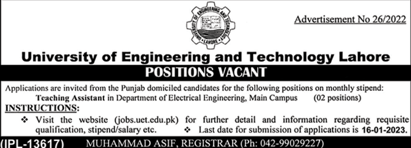 University of Engineering and Technology UET Lahore, lahore Punjab Pakistan invites applications from eligible candidates for the post of teaching assistant as per advertisement of December 29, 2022 published in daily Nawaiwaqt Newspaper. Educational qualifications required Master, Bachelor and Mphil etc.