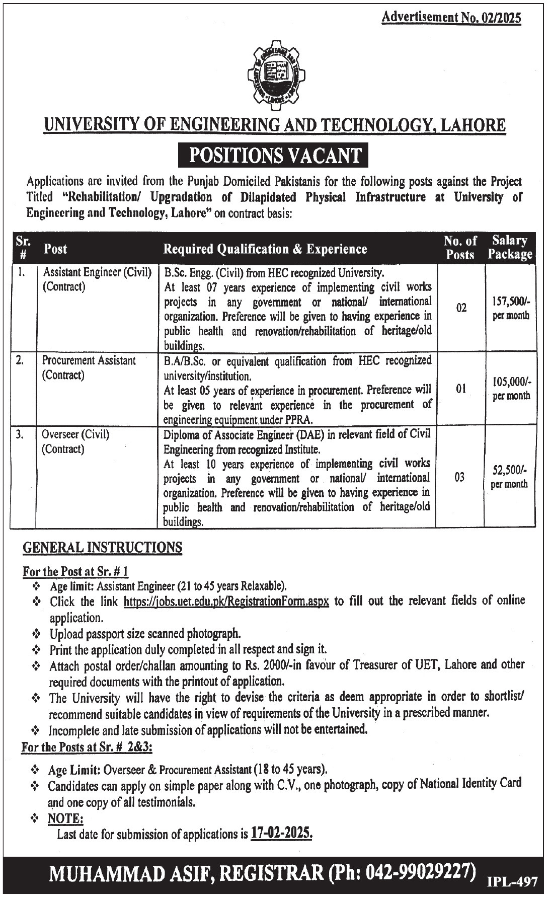 Vacancies in University of Engineering and Technology UET Advertisement February 2025