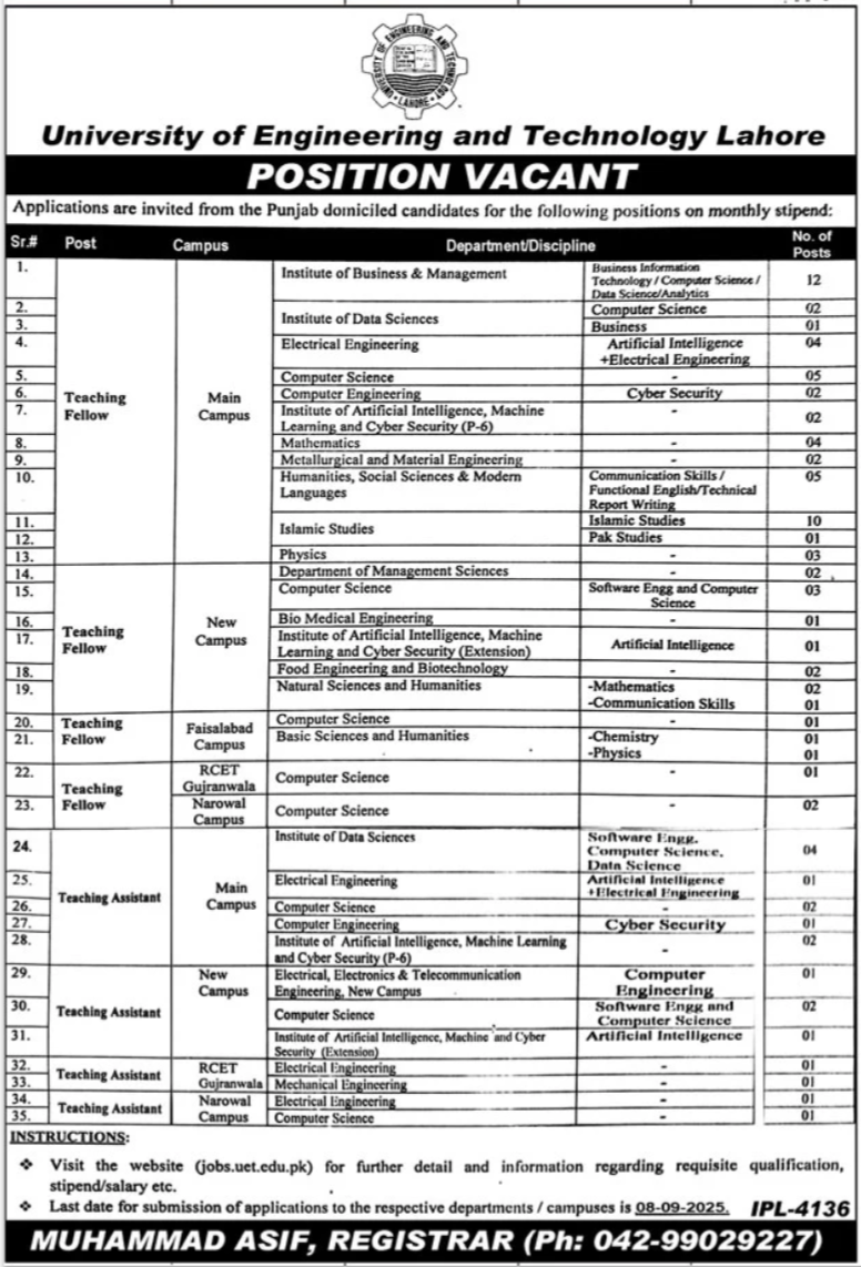 University of Engineering and Technology UET GT Road Lahore, narowal, faisalabad and gujranwala Punjab Pakistan invites applications from eligible candidates for the post of teaching fellow and teaching assistant as per advertisement of August 16, 2025 published in daily Jang Newspaper. Mphil, MS, Master and Others etc. educational qualification will be preferred.