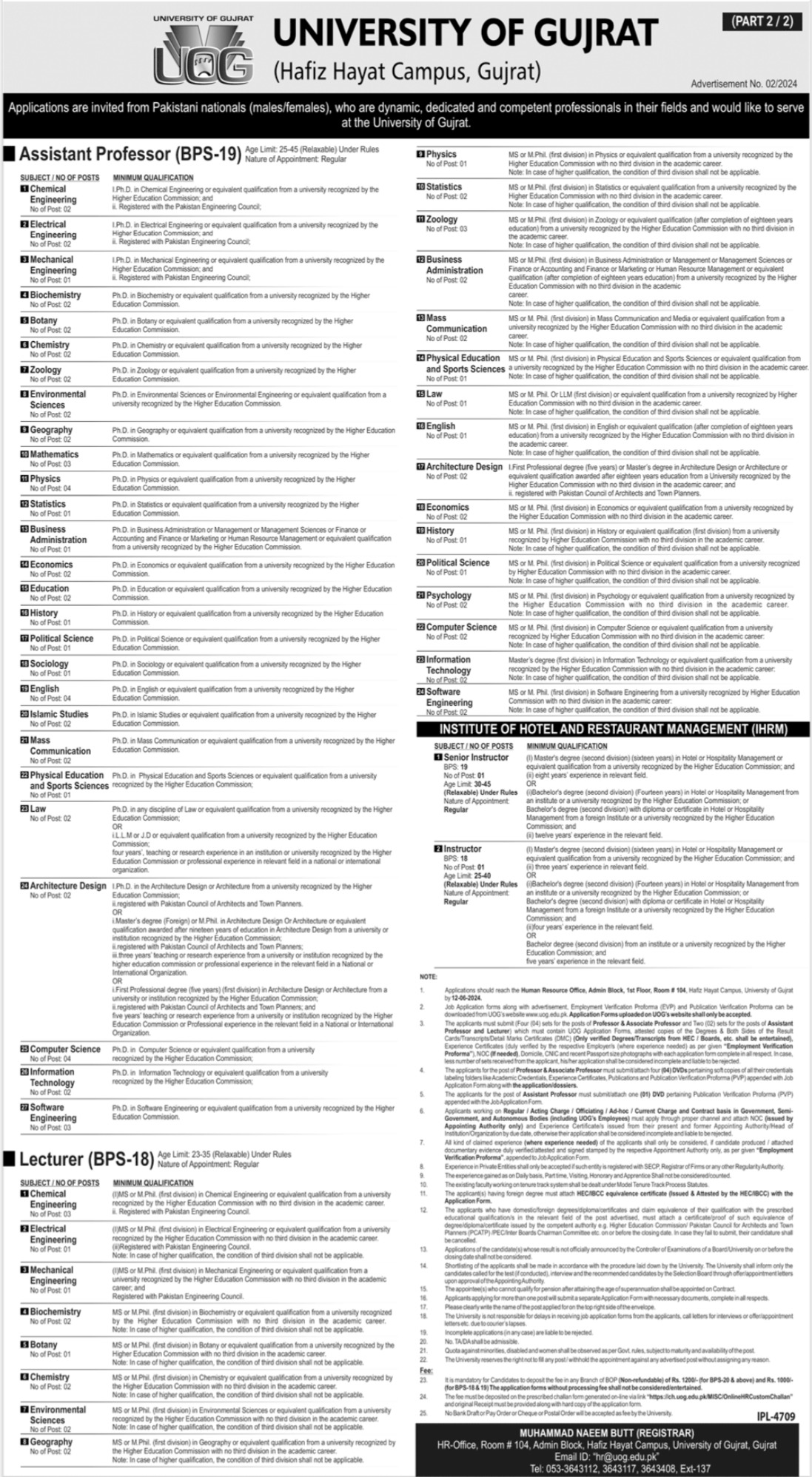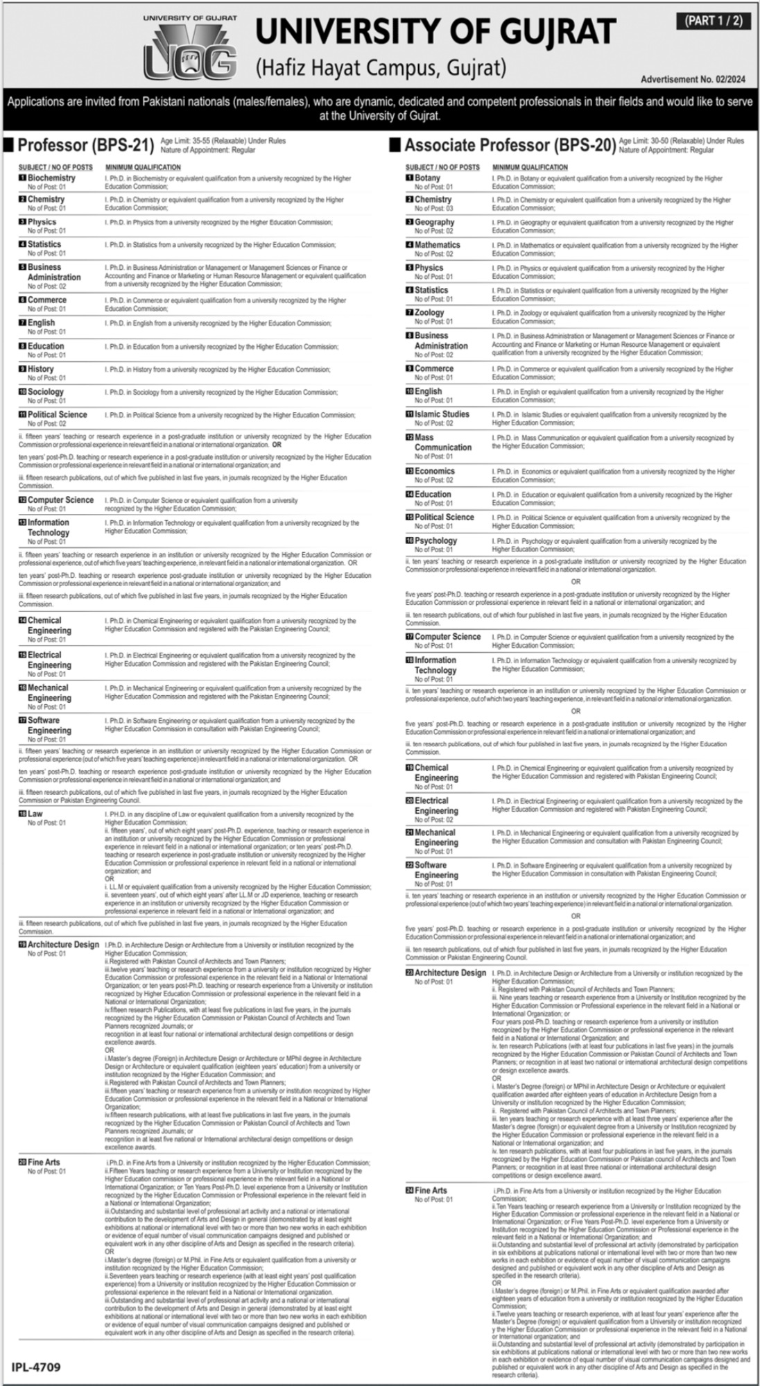 University of Gujrat UOG Gujrat, gujrat Punjab Pakistan invites applications from eligible candidates for the post of instructor, professor economics, professor commerce, professor political science, professor business administration, professor software engineering, professor zoology, assistant professor, professor history, professor geography, professor islamic studies, professor physics, professor mathematics, professor english, senior instructor, professor biochemistry, professor computer science, professor architecture design, professor chemistry, professor education, professor fine arts, professor sociology, professor statistics, lecturer, professor, professor electrical engineering, professor information technology, professor mass communication, associate professor, professor chemical engineering, professor mechanical engineering, professor botany and professor law as per advertisement of May 23, 2024 published in daily Jang Newspaper. Phd, Master, LLM, MA, Mphil and M.sc etc. educational qualification will be preferred.