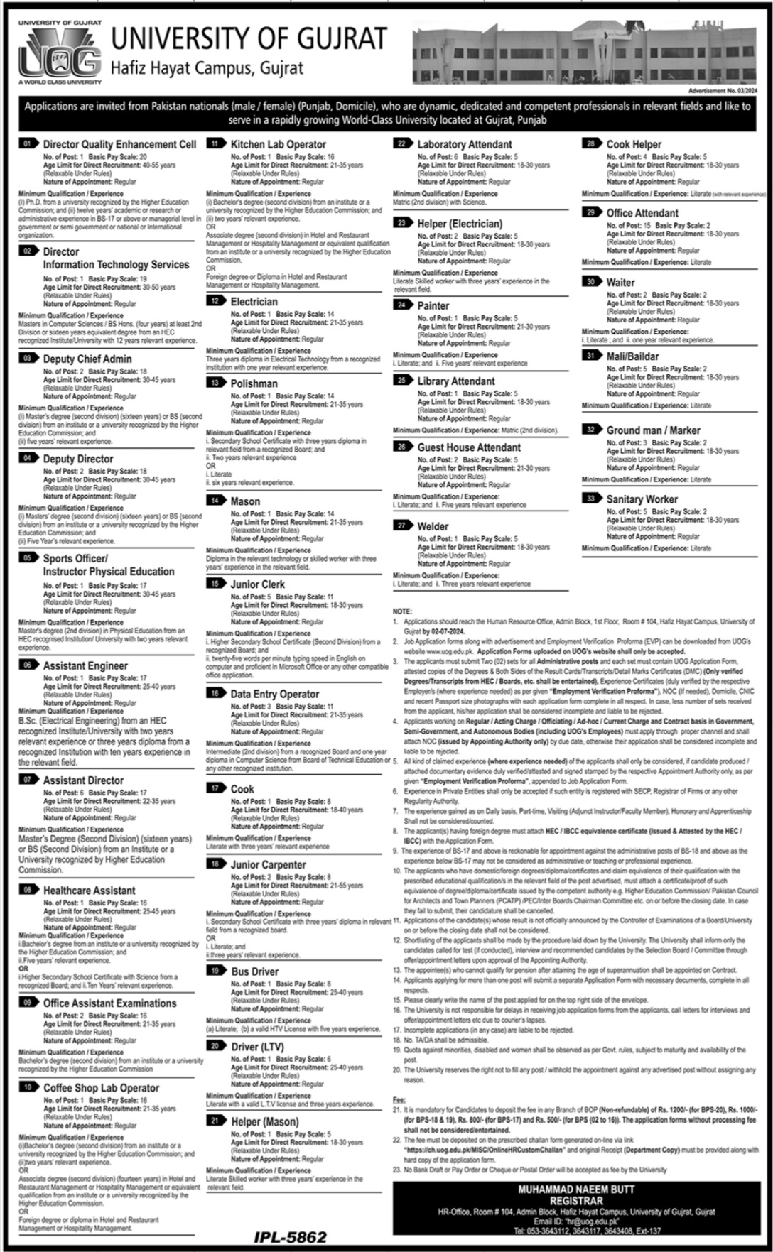 University of Gujrat UOG invites applications for job positions advertised in daily Jang dated 18 June 2024 for following vacancies in Gujrat, gujrat Punjab Pakistan.