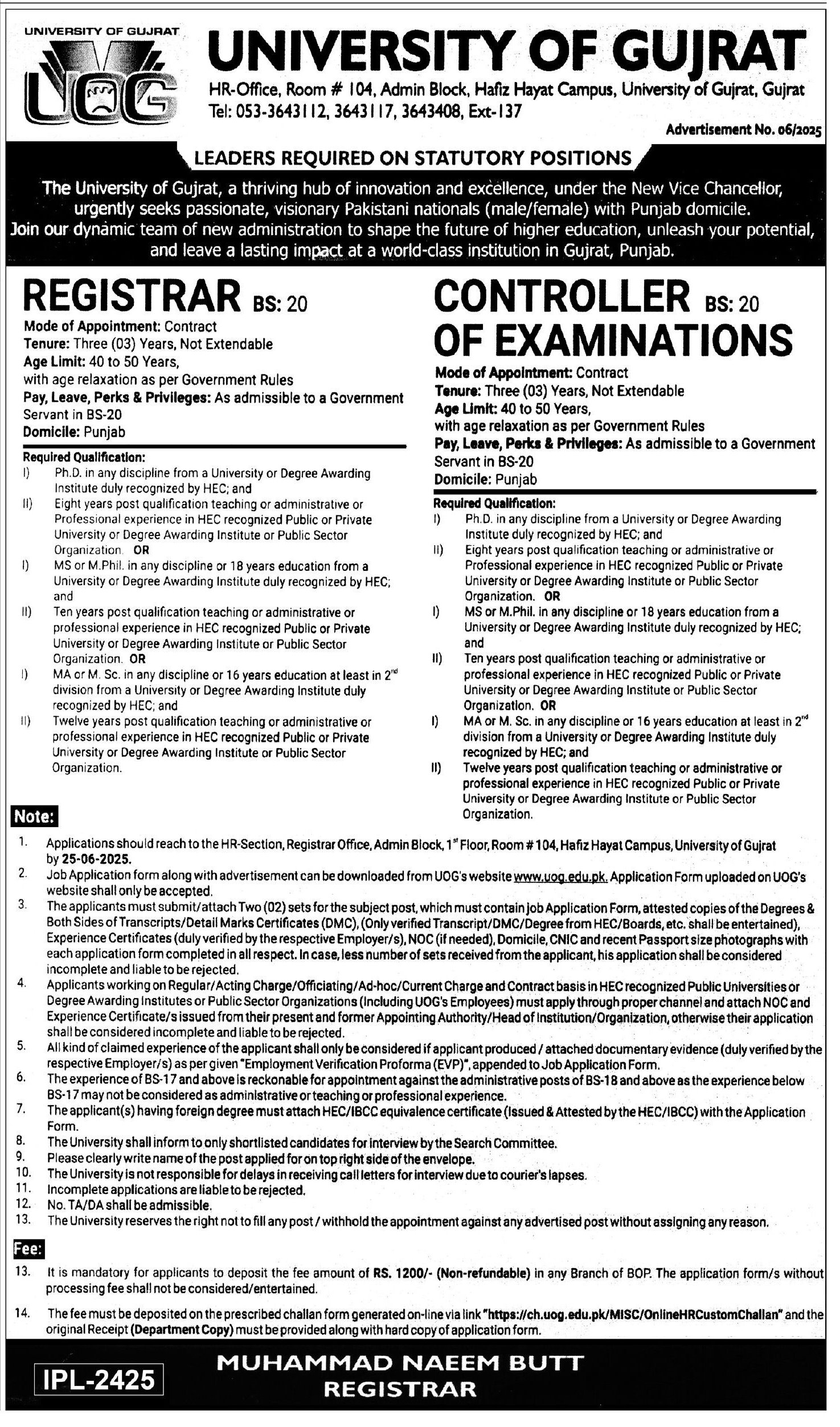University of Gujrat UOG Jalalpur Jattan Road Gujrat, gujrat Punjab Pakistan invites applications from eligible candidates for the post of controller of examinations and registrar as per advertisement of June 7, 2025 published in daily Express Tribune Newspaper. Candidates with Mphil, Others, MA, M.sc, MS and Phd etc. educational background will be preferred.
