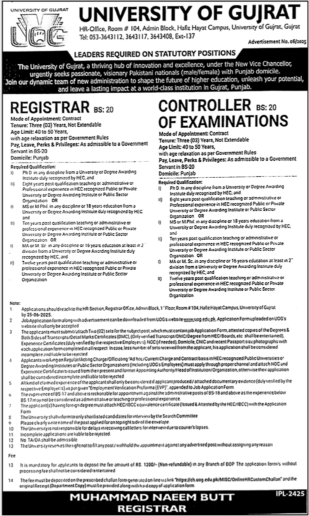 Vacant posts including registrar and controller of examination are announced in University of Gujrat UOG Gujrat, gujrat Punjab Pakistan as per 12 June 2025 advertisement in daily Jang Newspaper. Candidates with Master, Mphil, Phd and Bachelor etc. educational background will be preferred.