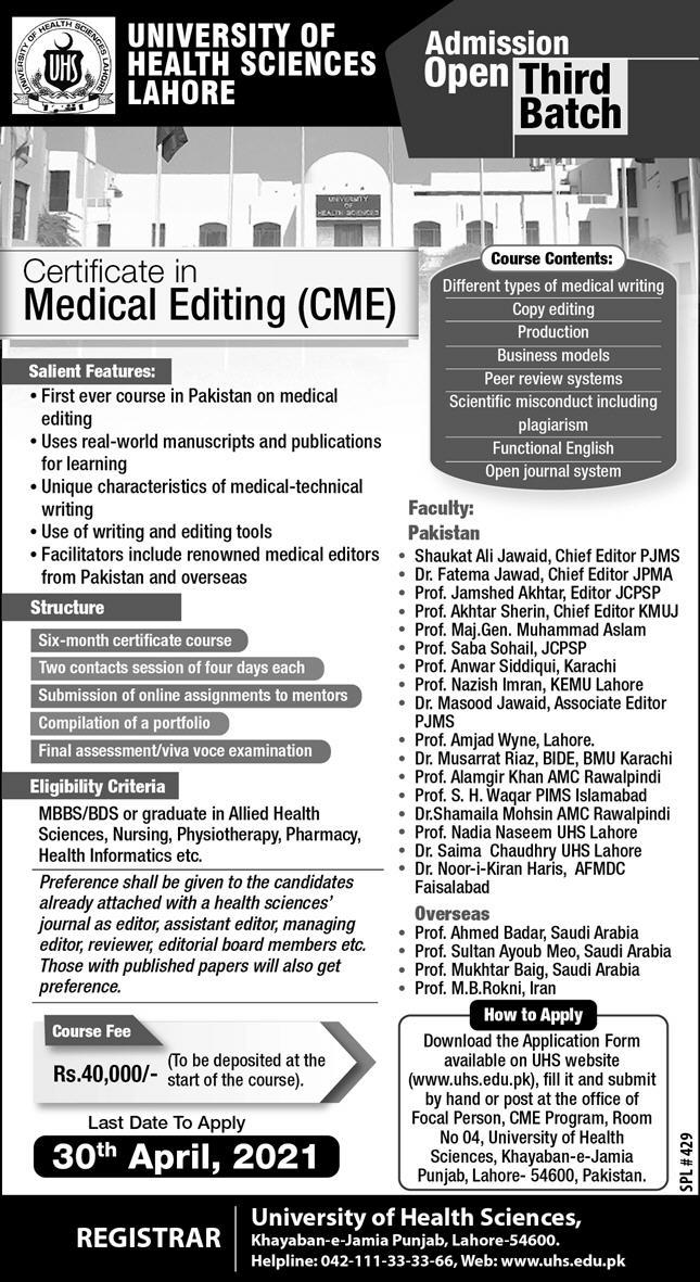 The University of Health Sciences UHS is a public research university has announced admission in Certificate in Medical Editing CME in Lahore Punjab Pakistan 2021. Read newspaper ad for exact details.