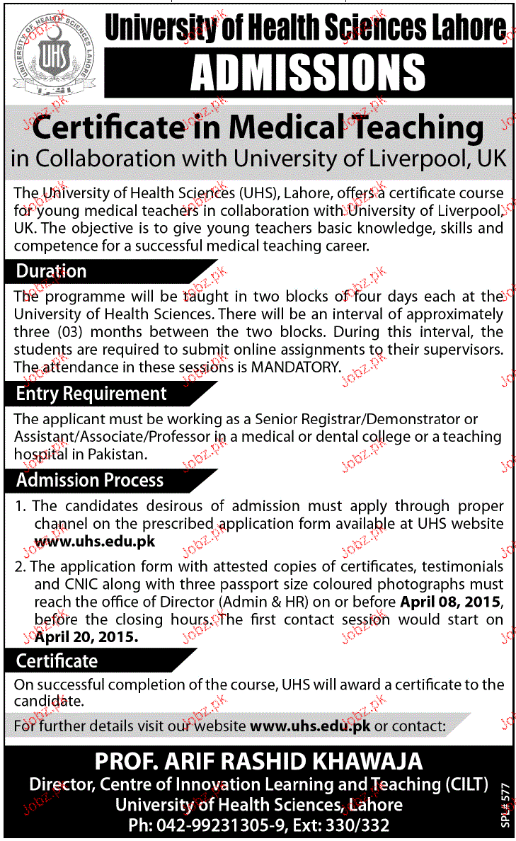University of Health Sciences Admission in Courses in Lahore. Read newspaper ad for exact details.