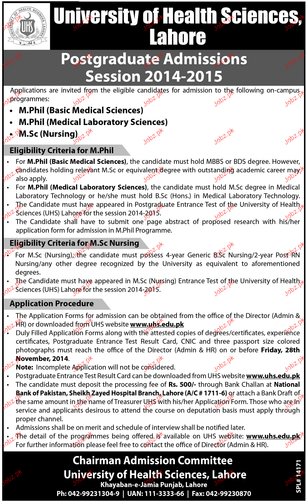 University of Health Sciences Admission in Mphill and MSc in Lahore. Read newspaper ad for exact details.