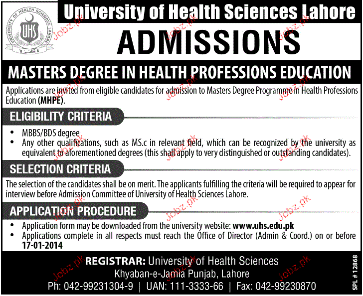 University of Health Sciences Lahore Admission in MA in Lahore Read newspaper ad for exact details.