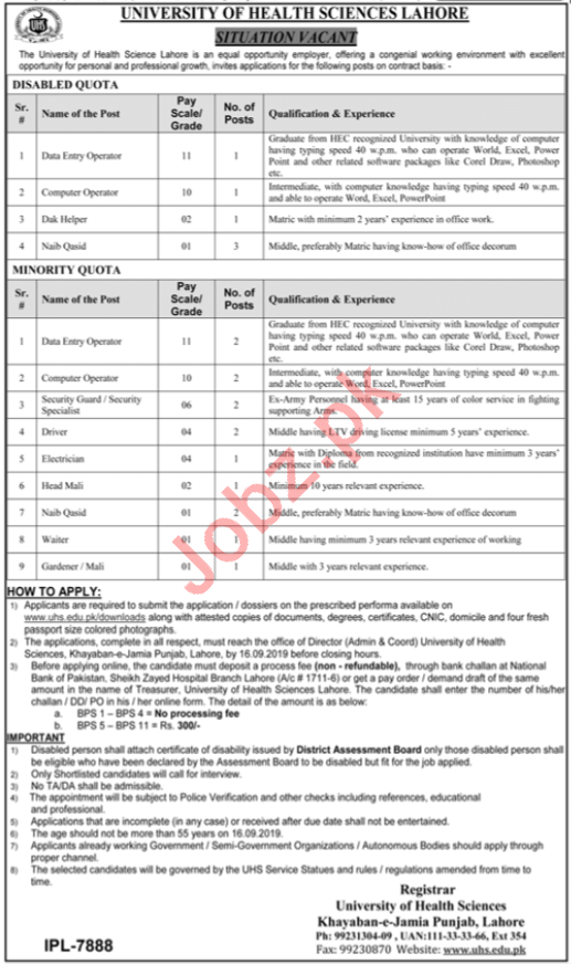 University of Health Sciences UHS Lahore, Government of the Punjab seeks candidates for the posts of Data Entry Operator, Computer Operator, Dak Helper, Naib Qasid, Security Guard, Security Specialist, Driver, LTV Driver, Electrician, Head Mali, Waiter, Mali, Gardener,
