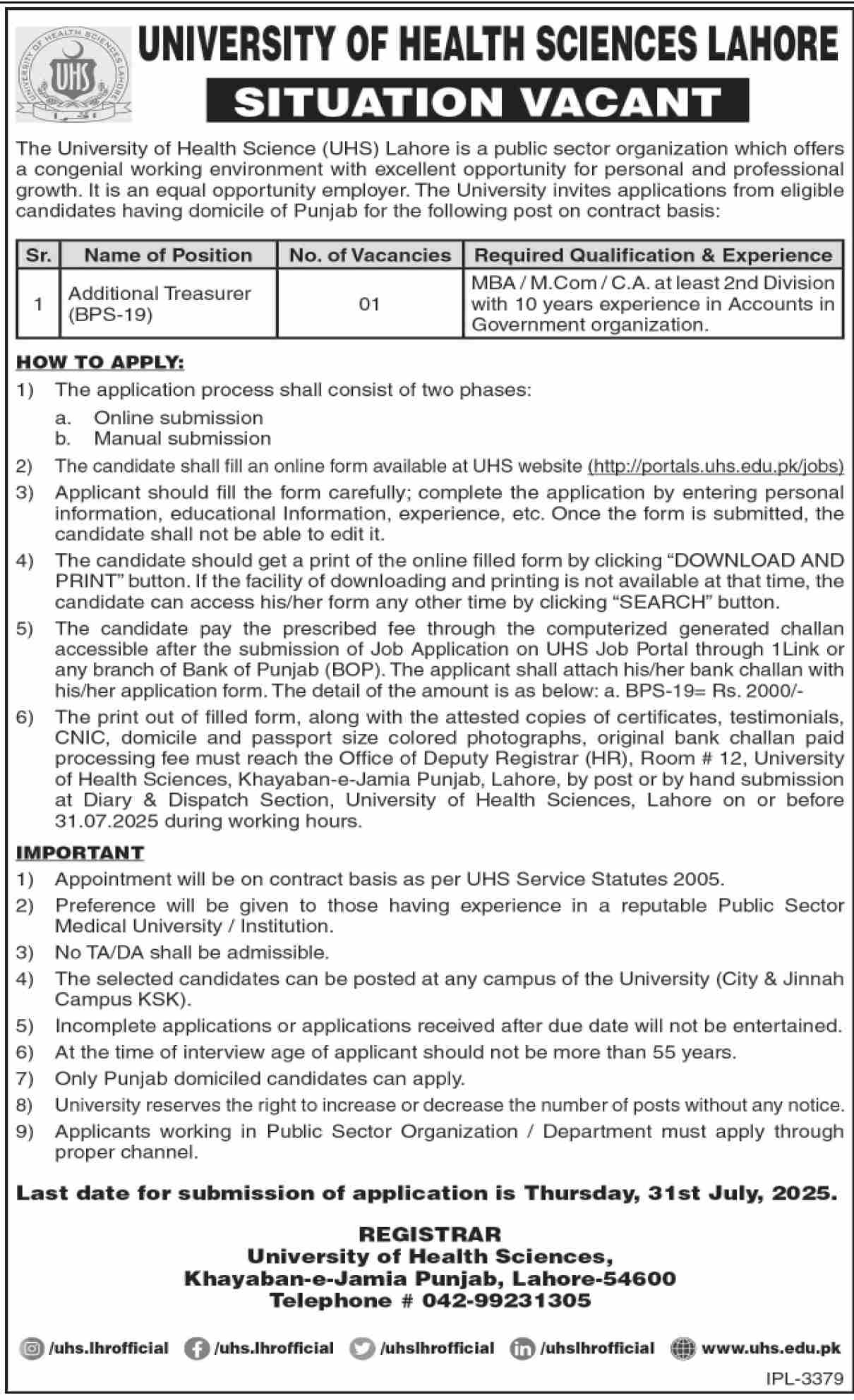 University of Health Sciences latest Government Management jobs and others can be applied till 31 July 2025 or as per closing date in newspaper ad. Read complete ad online to know how to apply on latest University of Health Sciences job opportunities.