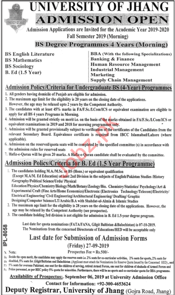 University of Jhang announces the admissions for the academic year 2019-20 in BS English Literature, BS Mathematics, BS Sociology, B.Ed, BBA in Jhang, Punjab. Last date to apply is 27 September, 2019. Read newspaper ad for exact details.