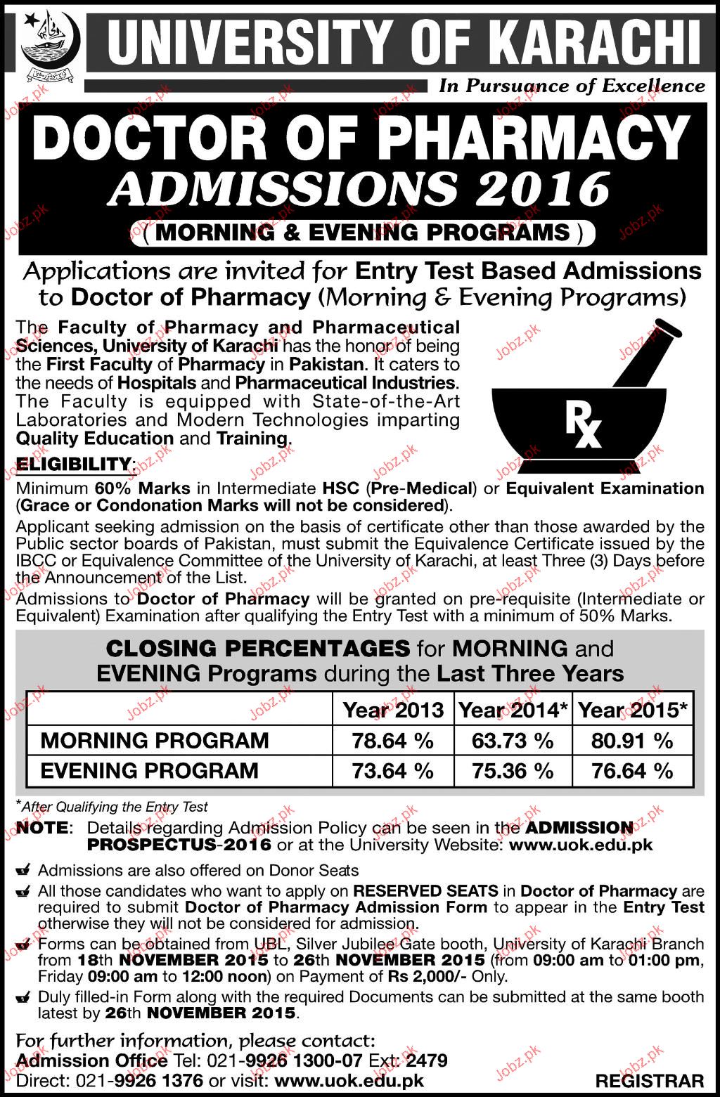 University of Karachi Admission in DPT in Karachi. Read newspaper ad for exact details.