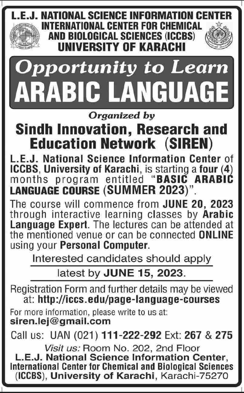 Admissions in University of Karachi 2023 for Arabic Language Course has been announced. Students can enroll for admissions in University of Karachi Karachi Kohat Sindh Pakistan for academic year 2023 to continue campus based or online education in Language Course. Students who want to enroll for academic session 2023 in Diploma and Course qualification and admission criteria for Government institute can apply till last date 15 June 2023. Read newspaper ad for exact details.
