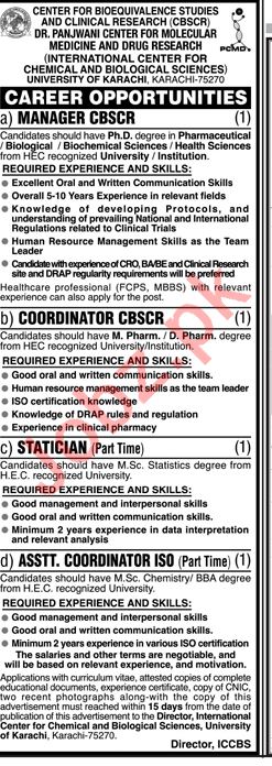 A Well-Known Government Organization International Center For Chemical and Biological Sciences, University Of Karachi is looking for qualified, expert and Well-Mannered staff for their Organization for the Job of Manager CBSCR, Coordinator CBSCR, Statician, Assistant Coordinator ISO.