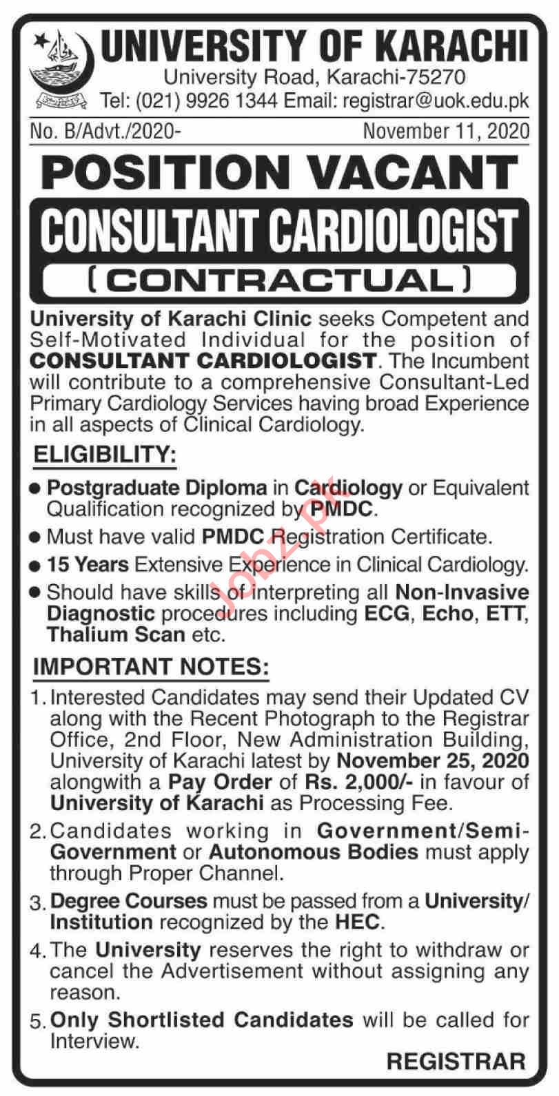 University Of Karachi Jobs 2020 For Consultant Cardiologist