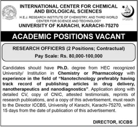 University of Karachi UoK Karachi, karachi Sindh Pakistan invites applications from eligible candidates for the post of research officer as per advertisement of March 30, 2025 published in daily Jang Newspaper. Candidates with Bachelor, Mphil, Master and Phd etc. educational background will be preferred.