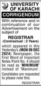 University of Karachi UoK invites applications for job positions advertised in daily Jang dated 10 December 2024 for following vacancies in Karachi, karachi Sindh Pakistan.
