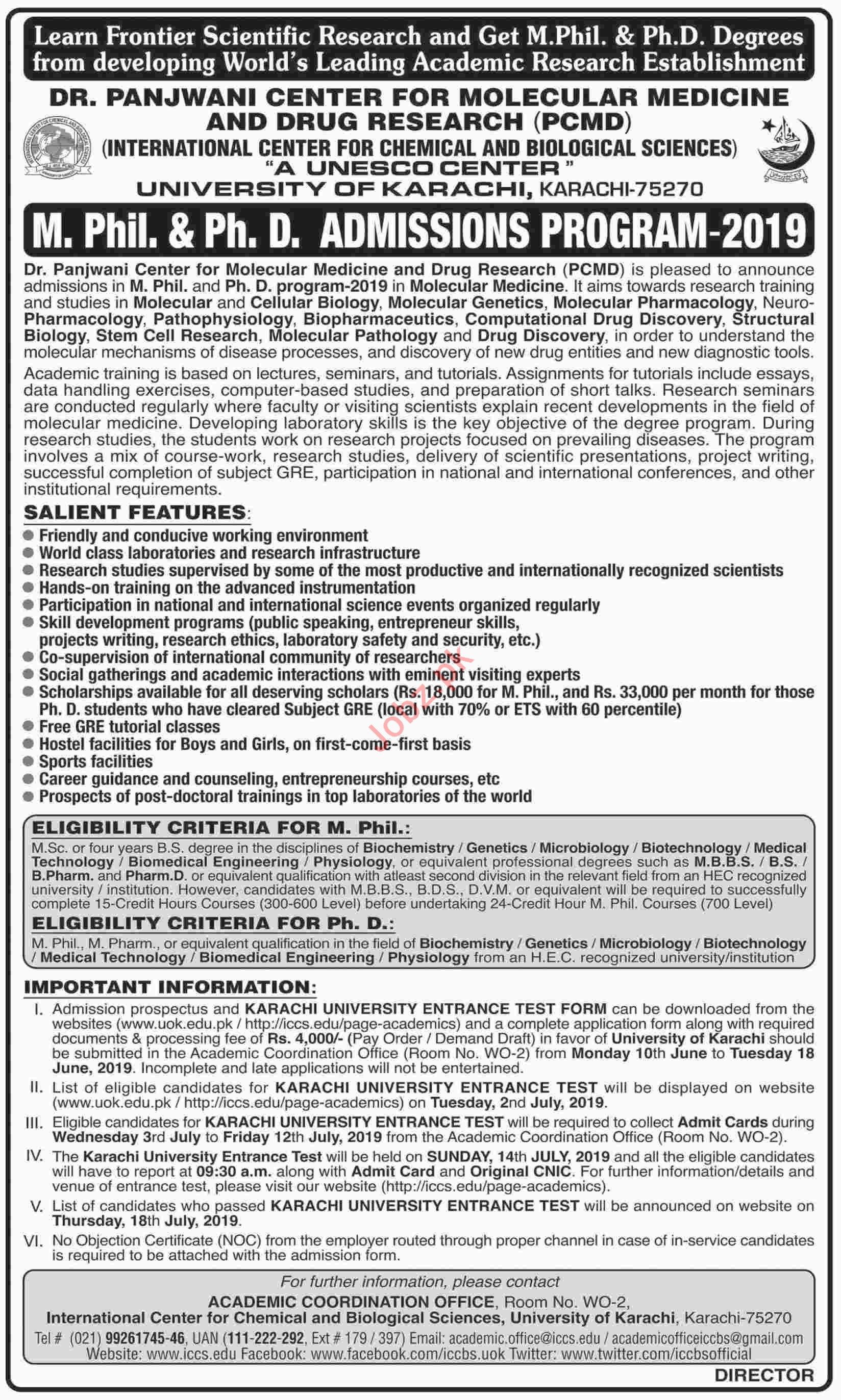 University of Karachi UOK, DR. Panjwani Center For Molecular Medicine & Drug Research PCMD has announced Admission 2019 for the degree of M.Phil and PhD in Karachi. Read newspaper ad for exact details.
