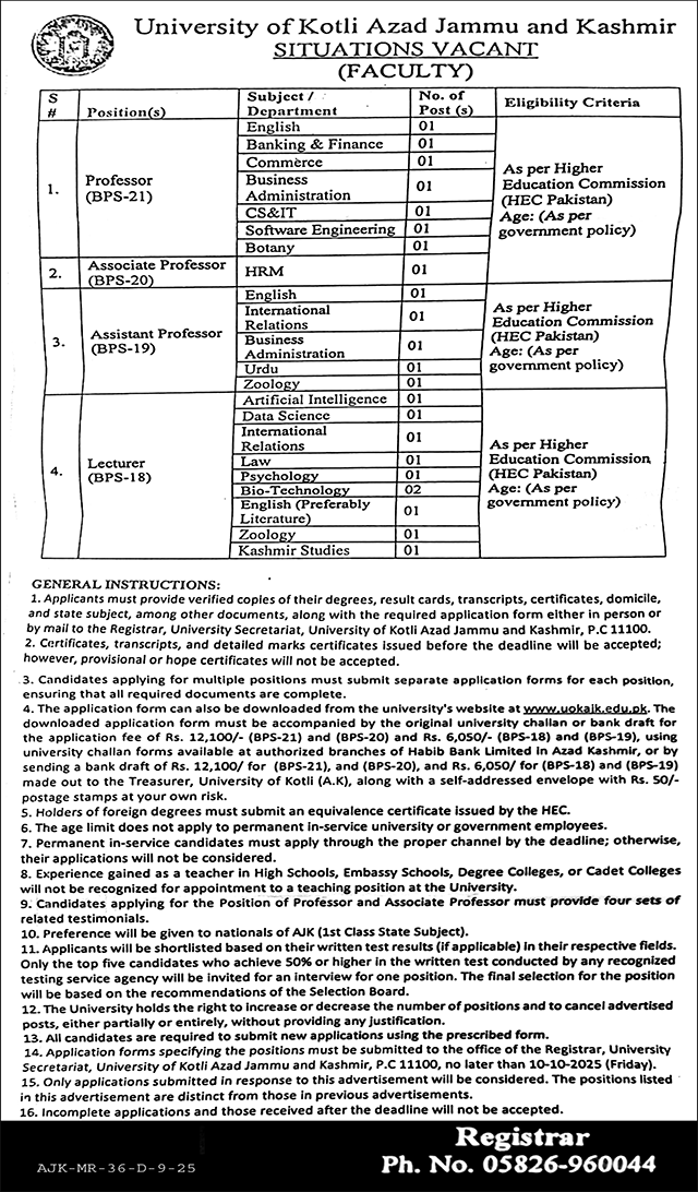 University of Kotli latest Government Education jobs and others can be applied till 10 October 2025 or as per closing date in newspaper ad. Read complete ad online to know how to apply on latest University of Kotli job opportunities.