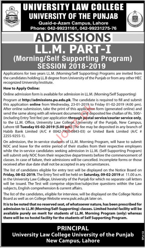 University of Law College, University of the Punjab has announced Admissions 2019 of LLM in Lahore. Last Date of Submission of Admission Form is February 08th 2019, Entry Test will be held on 09th February 2019. Read newspaper ad for exact details.