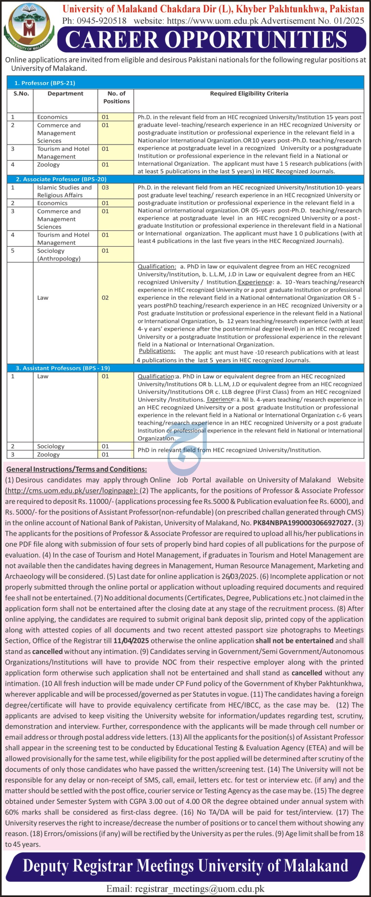 Vacancies in University of Malakand Advertisement March 2025