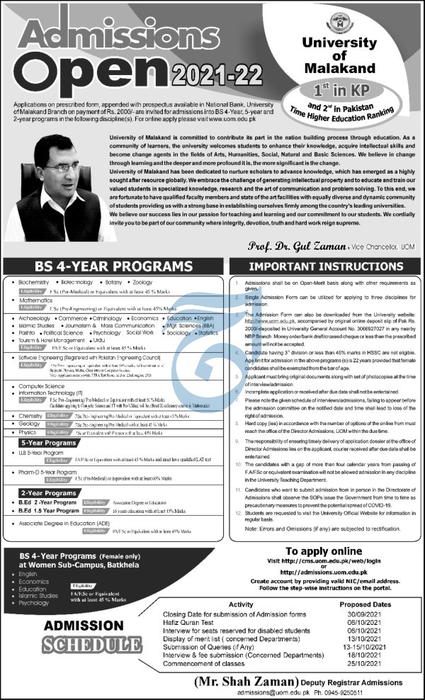University of Malakand is a public sector university invites applications for admissions in BS, LLB, Pharm-D, B.Ed and ADE degree programs in Malakand KPK 2021. Read newspaper ad for exact details.
