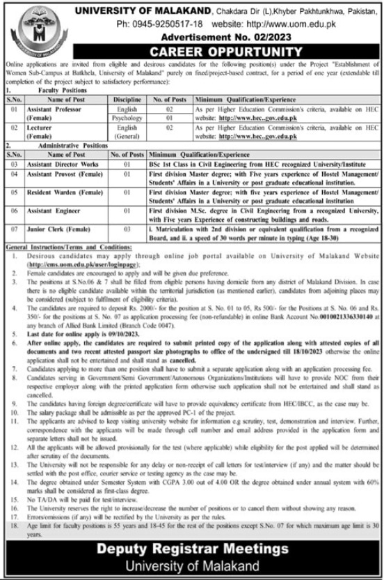 University of Malakand jobs advertisement dated about 25 September 2023 in daily Mashriq Newspaper invites application for the vacant post of assistant professor, assistant engineer, lecturer, assistant director work, clerk, resident warden and assistant provost in Malakand, malakand Khyber Pakhtunkhwa KPK Pakistan. Mphil, Phd, Bachelor and Master etc. educational qualification will be preferred.