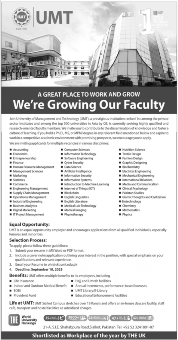 University of Management and Technology Sialkot, sialkot Punjab Pakistan invites applications from eligible candidates for the post of lecturer, visiting faculty and professor as per advertisement of August 17, 2025 published in daily Jang Newspaper. Preferred Education is Phd, Mphil, Bachelor and Master etc.