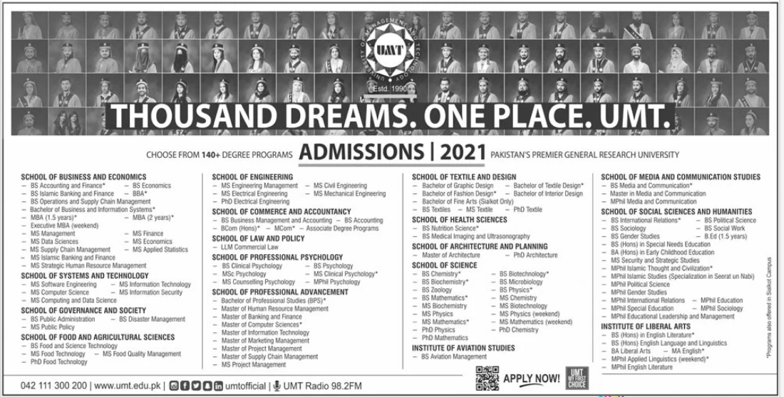 University of Management & Technology UMT is a private sector university has announced admissions in BS, MBA, BBA, MS, PhD, LLM, B-Com, MSc, B.Ed and M.Phil degree programs 2021. Read newspaper ad for exact details.