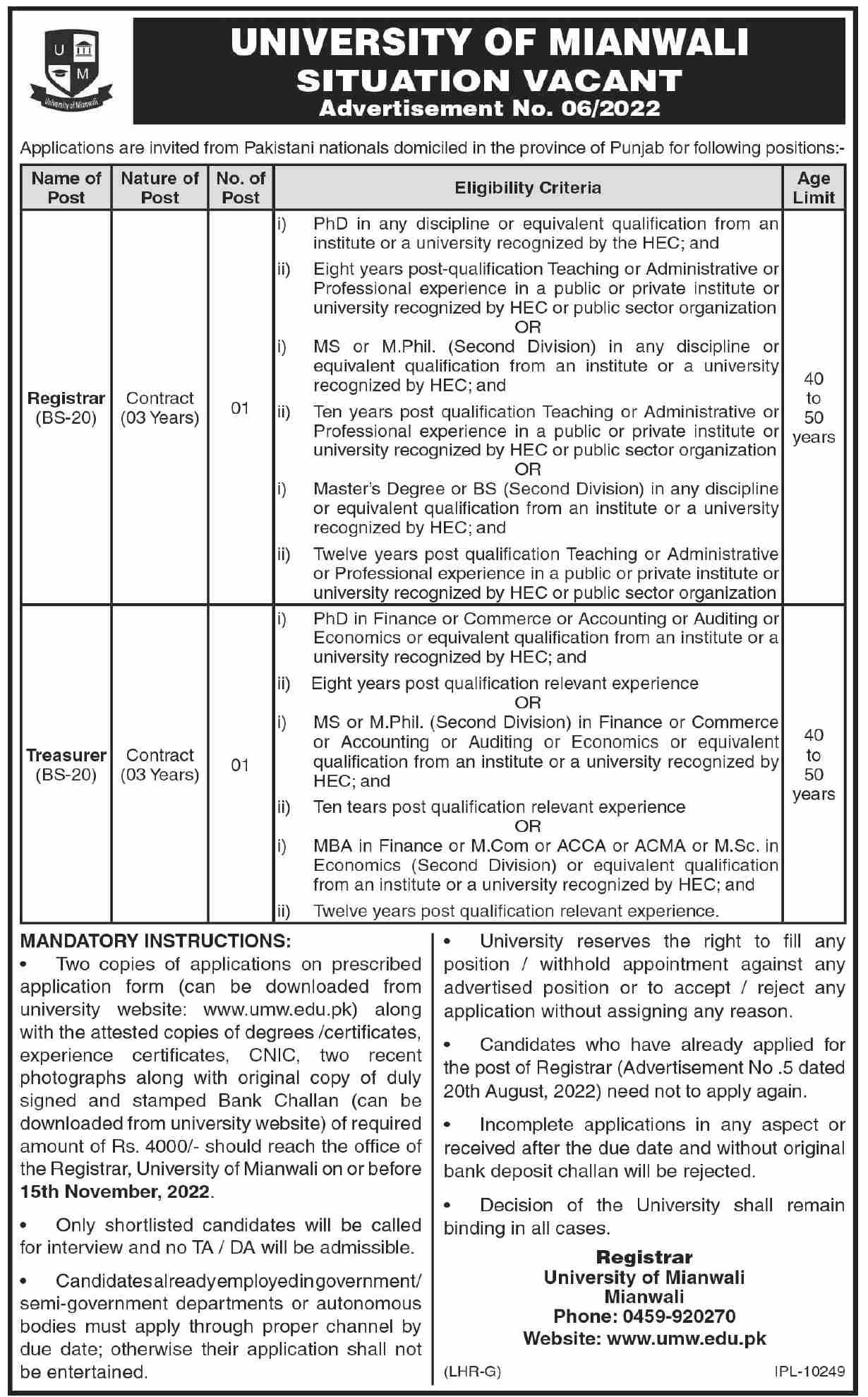 University of Mianwali Mianwali, mianwali Punjab Pakistan invites applications from eligible candidates for the post of treasurer and registrar as per advertisement of October 14, 2022 published in daily Dawn Newspaper. Educational qualifications required Mphil, MS and Phd etc.