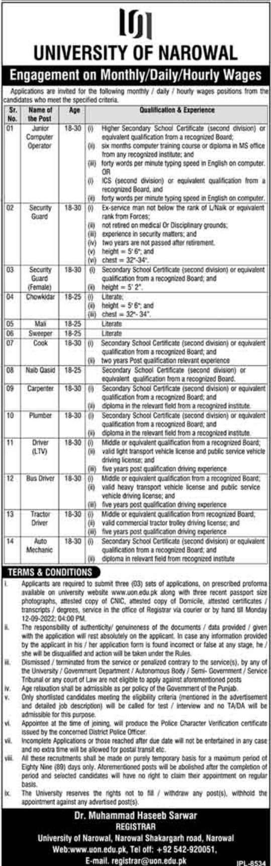 Vacant posts including naib qasid, auto mechanic, chowkidar, carpenter, tractor driver, ltv driver, sweeper, mali, security guard, cook, driver, plumber, bus driver and computer operator are announced in University of Narowal Narowal, narowal Punjab Pakistan as per 25 August 2022 advertisement in daily Dunya Newspaper. Educational qualifications required Middle, Intermediate, Primary and Matric etc.