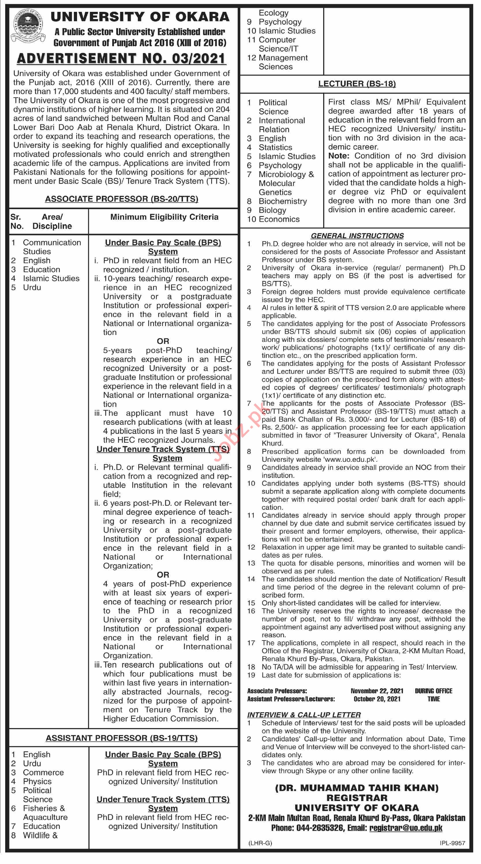 Vacancies in University Of Okara Advertisement September 2021