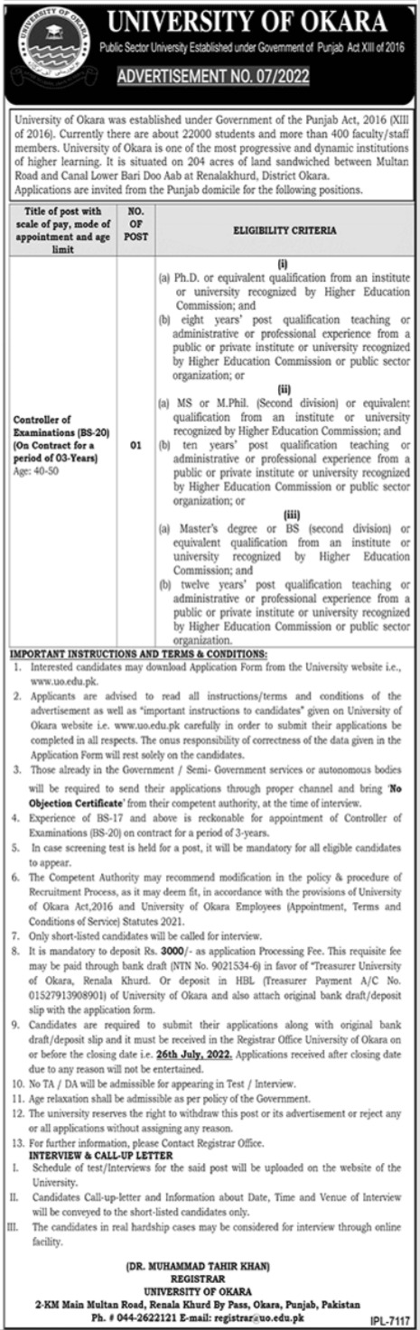 Vacant posts including controller of examination are announced in University Of Okara Islamabad, islamabad Islamabad Pakistan as per 8 July 2022 advertisement in daily Other Newspaper. Candidates with Master, Phd and Mphil etc. educational background will be preferred.