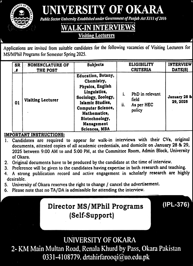 Apply at University Of Okara latest Government walk in interview jobs in Teaching and departments before closing date which is around January 29, 2025 or as per closing date in newspaper ad. Read complete ad online to know how to apply on latest University Of Okara job opportunities.
