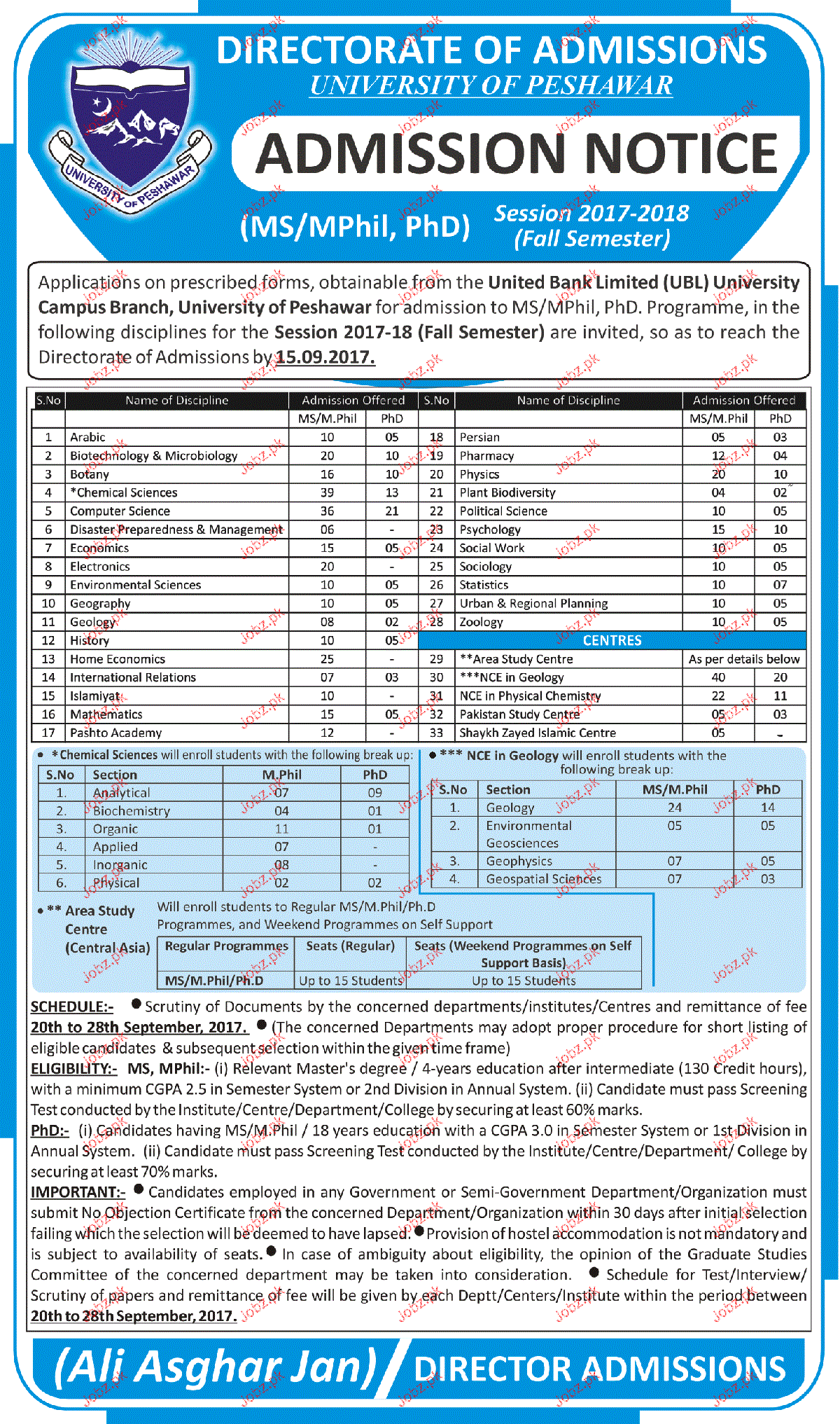 University of Peshawar Admission in MS / Mphill / Phd in Peshawar. Read newspaper ad for exact details.
