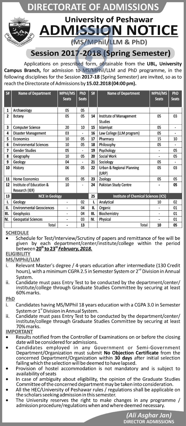 University of Peshawar Admission in MS / Mphill in Subjects of Computer Sciences, Economics, Pharmacy, Social Works, Islamiat, Gender Studies and Botany in Peshawar. Read newspaper ad for exact details.