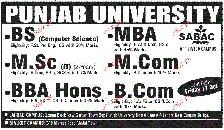 University of Punjab Admission in BS, MBA, MSc, MCom and BBA in Lahore Read newspaper ad for exact details.