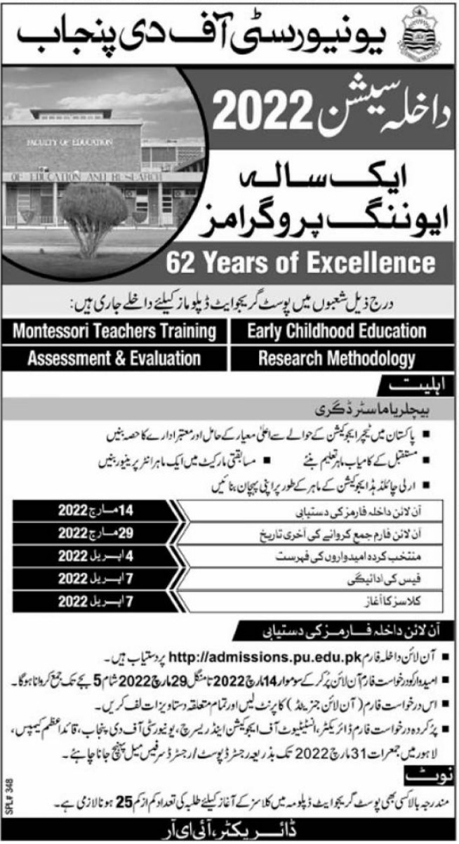 University of Punjab UOP has announced admissions 2022 for pg diploma,. Students who want to take admissions in University of Punjab UOP Lahore Punjab Pakistan for academic year 2022 to continue education in Other University can apply. Students for admissions in P.G Diploma & criteria can apply as per Government institute admission policy 2022 before closing date March 29, 2022 as per advertisement. Read newspaper ad for exact details.