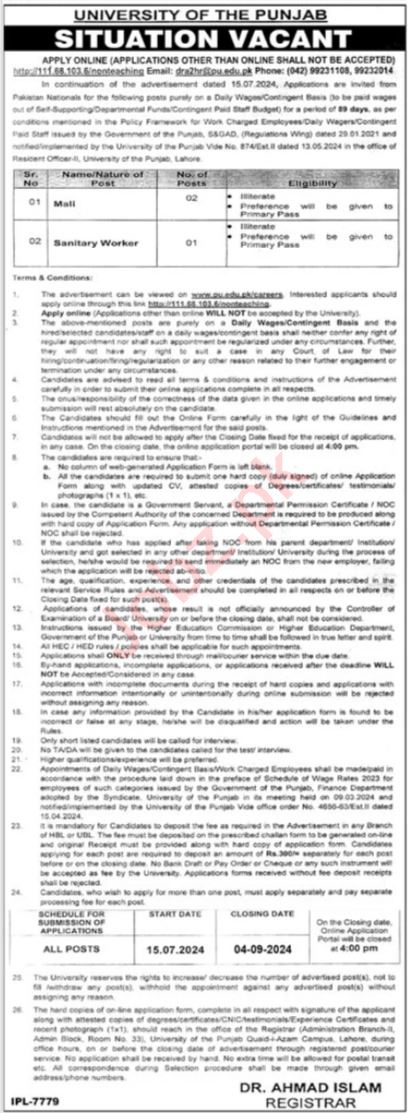 University of Punjab UOP latest Government Management jobs and others can be applied till September 4, 2024 or as per closing date in newspaper ad. Read complete ad online to know how to apply on latest University of Punjab UOP job opportunities.