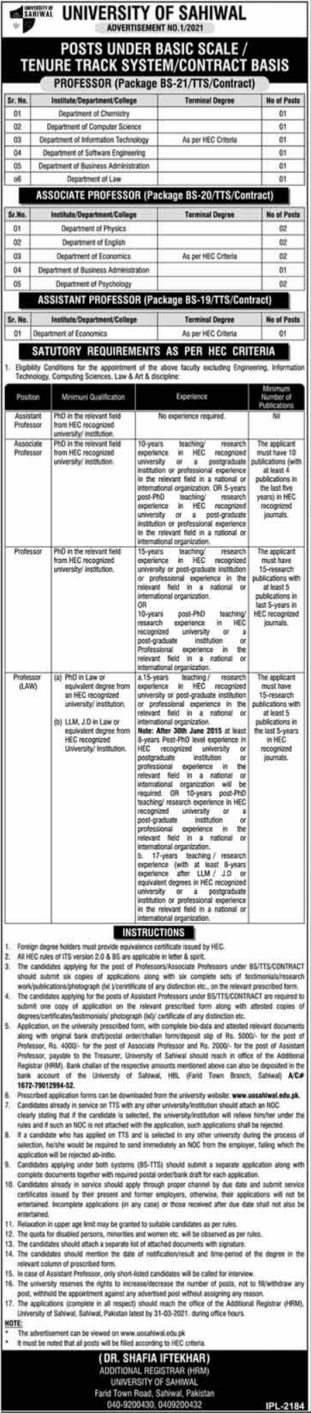 Vacancies in University of Sahiwal Advertisement March 2021