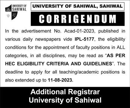 Latest Education jobs and others Government jobs in University of Sahiwal closing date is around August 11, 2023, see exact from ad. Read complete ad online to know how to apply on latest University of Sahiwal job opportunities.