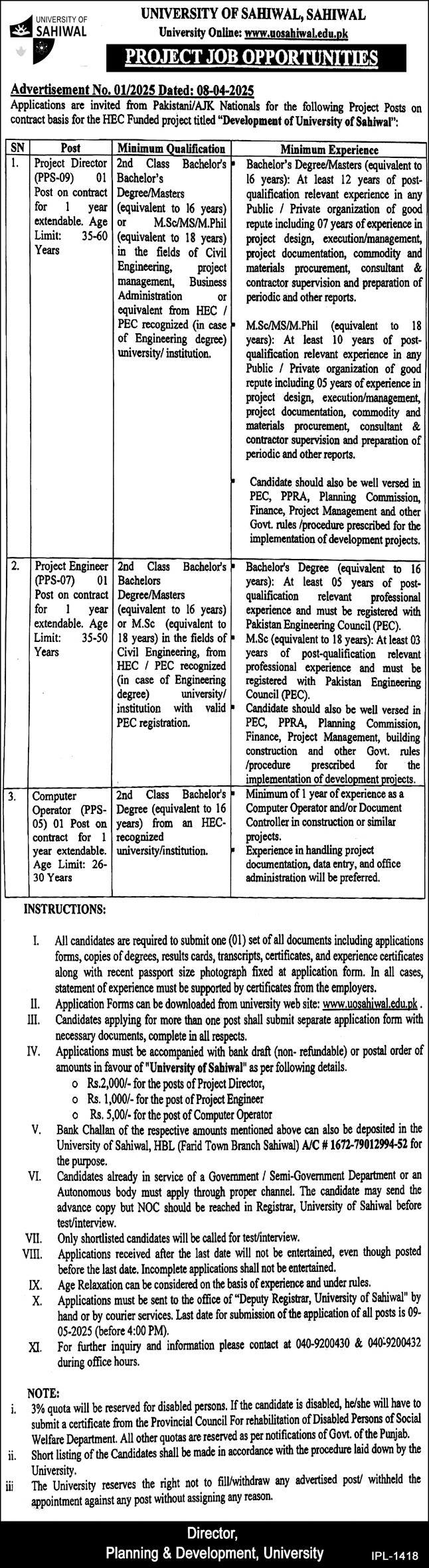 University of Sahiwal Farid Town Road Sahiwal, sahiwal Punjab Pakistan invites applications from eligible candidates for the post of project engineer, project director and computer operator as per advertisement of April 19, 2025 published in daily Express Newspaper. Mphil, M.sc, Bachelor, Master and MS etc. educational qualification will be preferred.