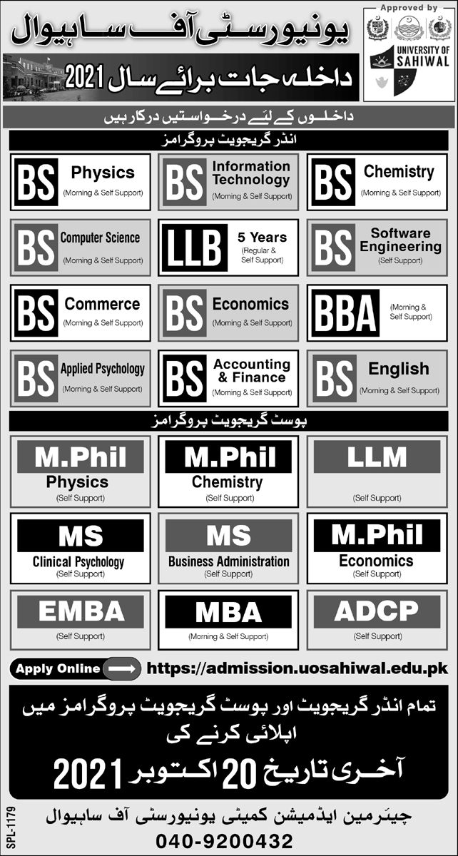 The University of Sahiwal is a public sector university invites applications for admissions in Undergraduate Programs & Postgraduate Programs in Sahiwal Punjab Pakistan 2021. Read newspaper ad for exact details.