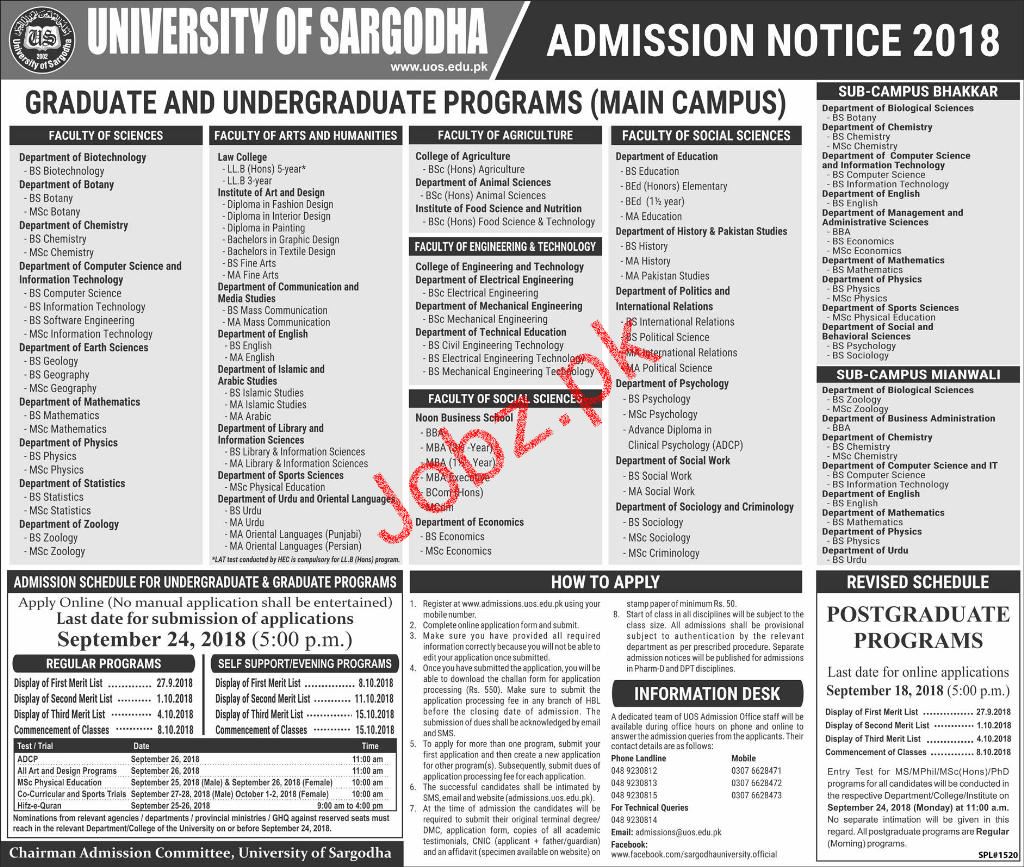 University of Sargodha Admission in Mphill, Phd, MSc, BS English, BS Geology, BS Geography, BS Mathematics, BS Civil Engineering, MA Arabic and Bs Maths in Sargodha. Read newspaper ad for exact details.